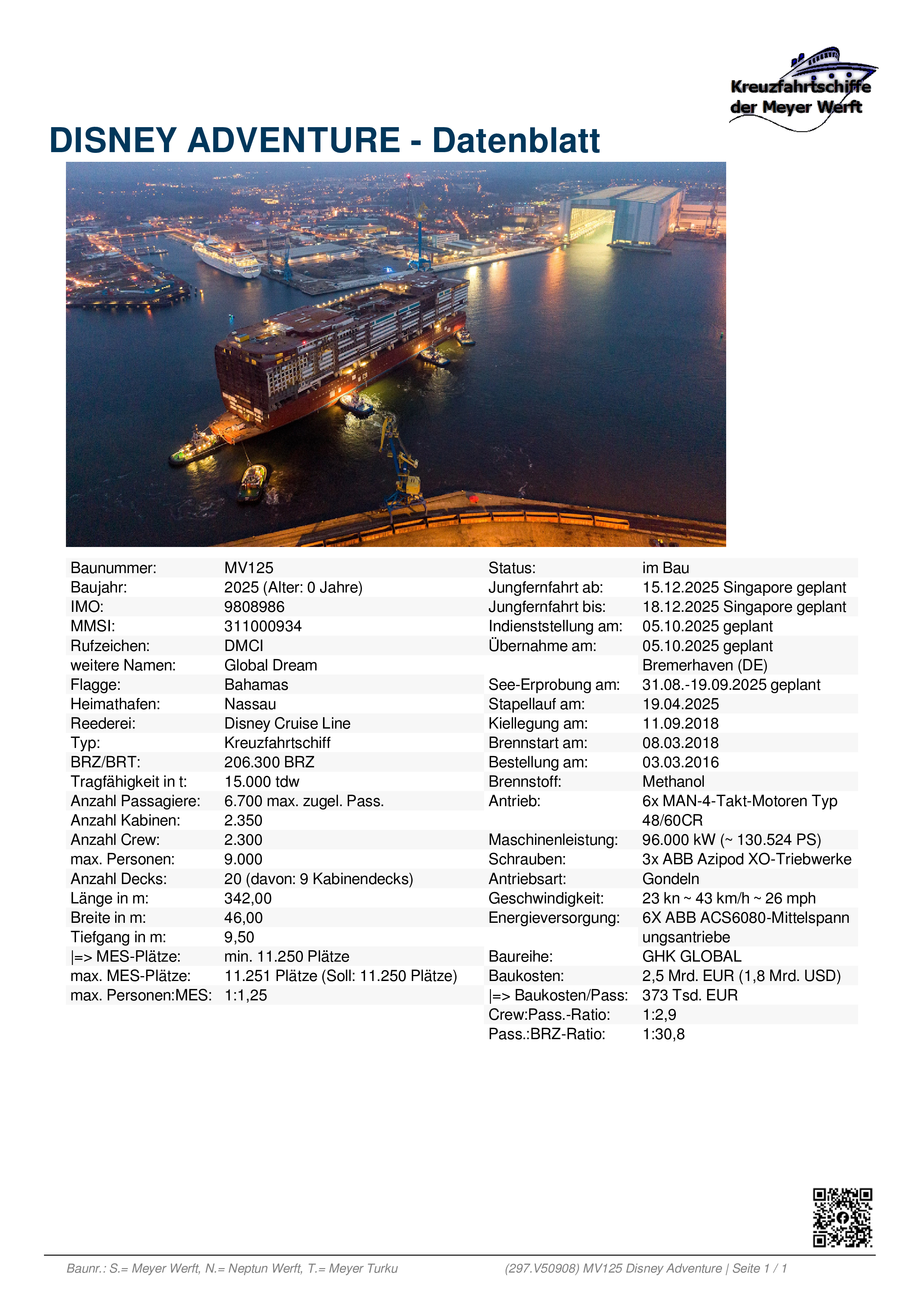 In der Facebook-Gruppe Kreuzfahrtschiffe der Meyer Werft sind die Datenblätter bereits bekannt. Die Daten wurden von einem kleinen Team nach bestem Wissen zusammengetragen und visualisiert. Sie stehen für (fast) jedes Stahlschiff zur Verfügung, das auf den Werften der Meyer-Gruppe gebaut wurde/wird.Dabei wird unterschieden nach: