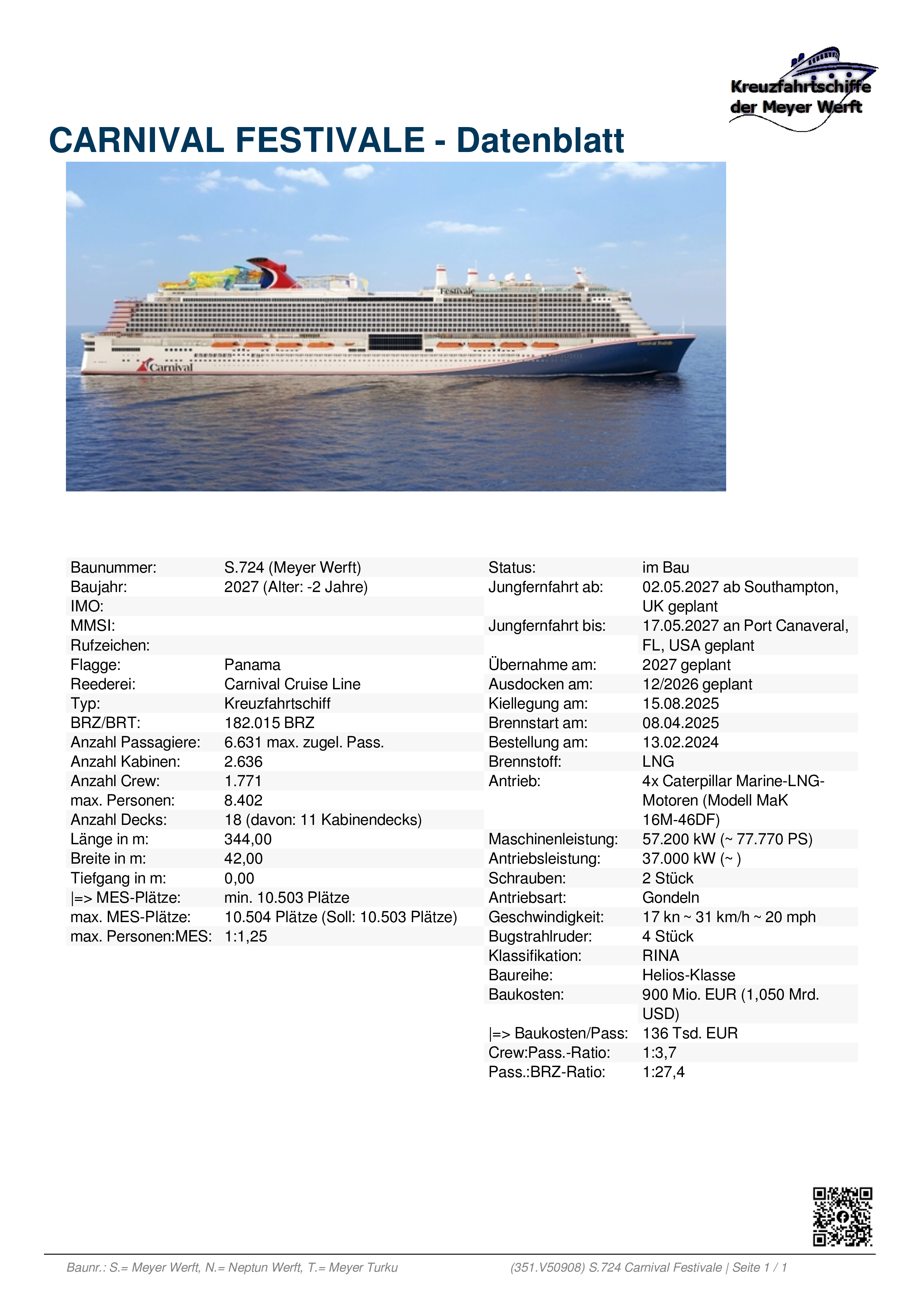 In der Facebook-Gruppe Kreuzfahrtschiffe der Meyer Werft sind die Datenblätter bereits bekannt. Die Daten wurden von einem kleinen Team nach bestem Wissen zusammengetragen und visualisiert. Sie stehen für (fast) jedes Stahlschiff zur Verfügung, das auf den Werften der Meyer-Gruppe gebaut wurde/wird.Dabei wird unterschieden nach: